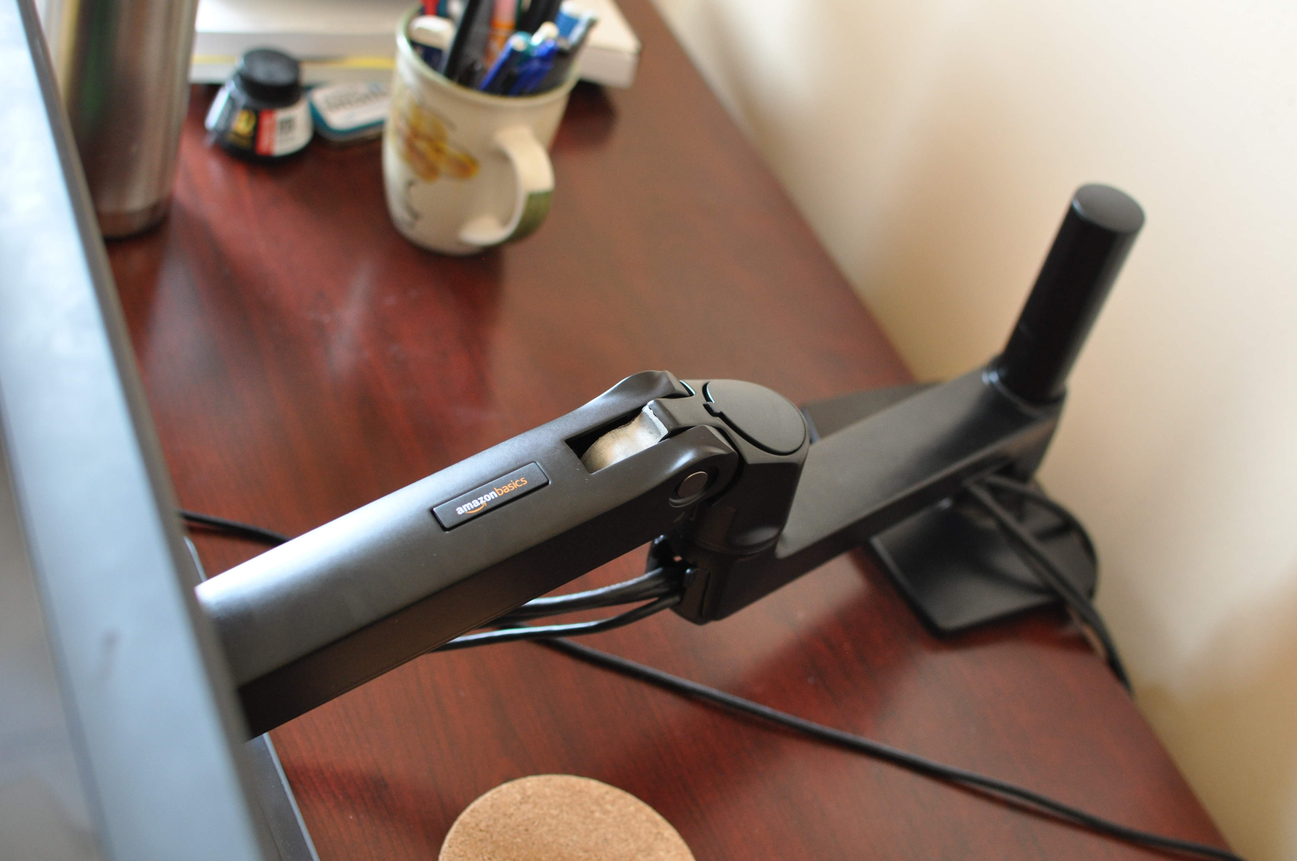 Once I got it, I realized I didn’t love using the stand that it comes with, it made it tough to see my second monitor and I wasn’t really sure what to do with my keyboard. So I did a little research into what sorts of monitor mounts were out there and the general consensus seemed to be that the Ergotron monitor arm was the way to go for Cintiq users. During my search, I saw that Amazon’s own line of products had a very similar looking monitor arm for a much better price. Many reviewers said they had basically copied the Ergotron’s model, so I decided to go with the Amazon Basics arm and I am glad I did! Now I can switch between having my Cintiq hover over my desk like a regular monitor and having it hanging off the edge of my desk and turned upwards, which I like for drawing much better than any of the stand positions. Pictures might help explain: